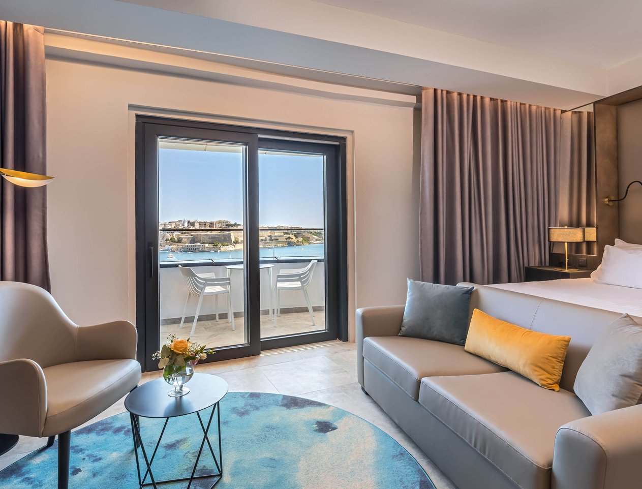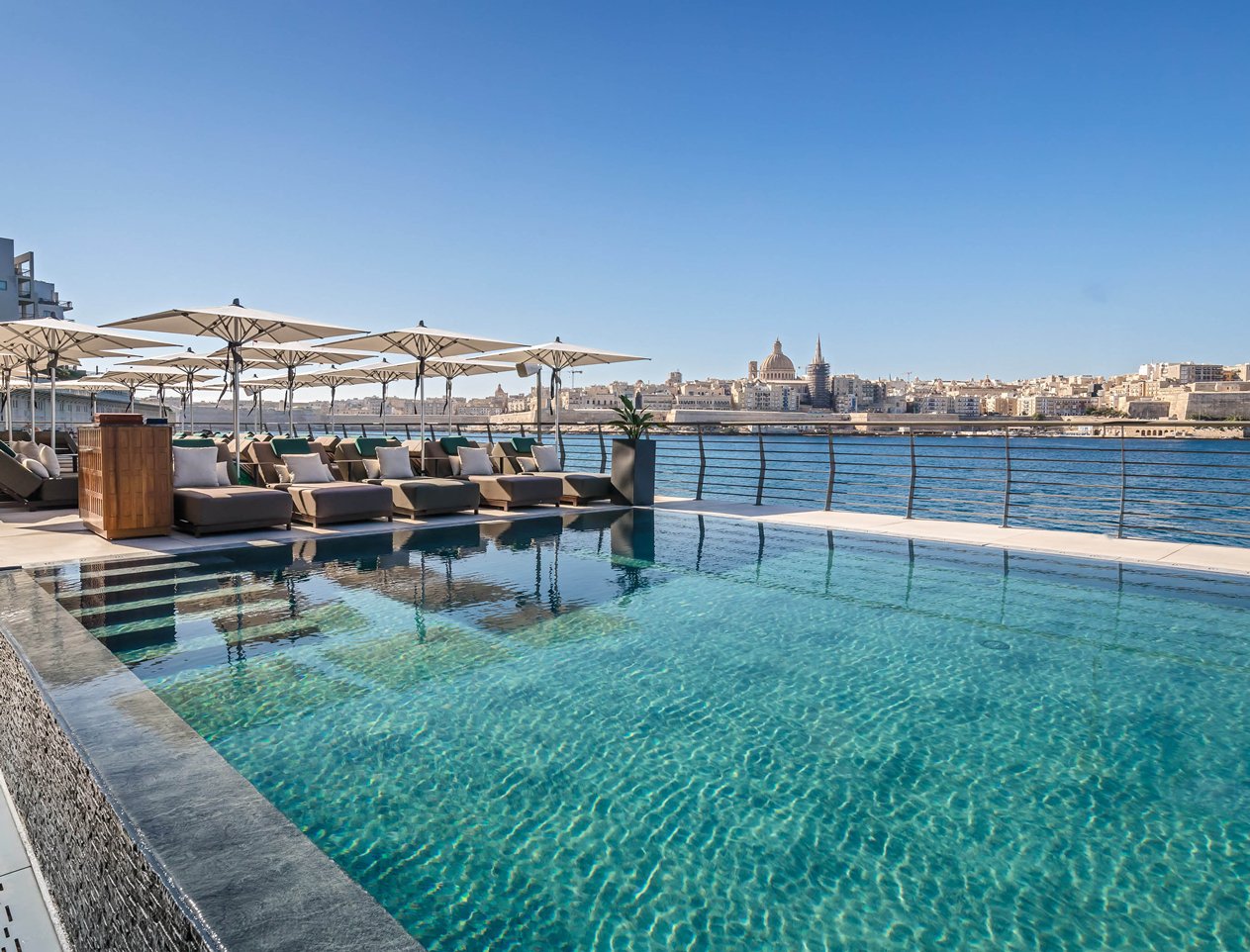 Fortina Spa Resort is a resort with facilities that are among the best in class for a five-star hotel. The resort consists of 46 units, and guests can do as much or as little as they want with ideal facilities for relaxing or active types. The Fortina overlooks the island's majestic capital, Valletta, and has great panoramic views from the front, out to sea, and over to Marsamxetto harbor. The atmosphere is relaxing and mellow with a sophisticated ambiance. The hotel has established itself throughout Europe as one of the best short-break spa treatment centers, offering various treatments to suit all budgets. Décor is elegant and designed to relax the senses.