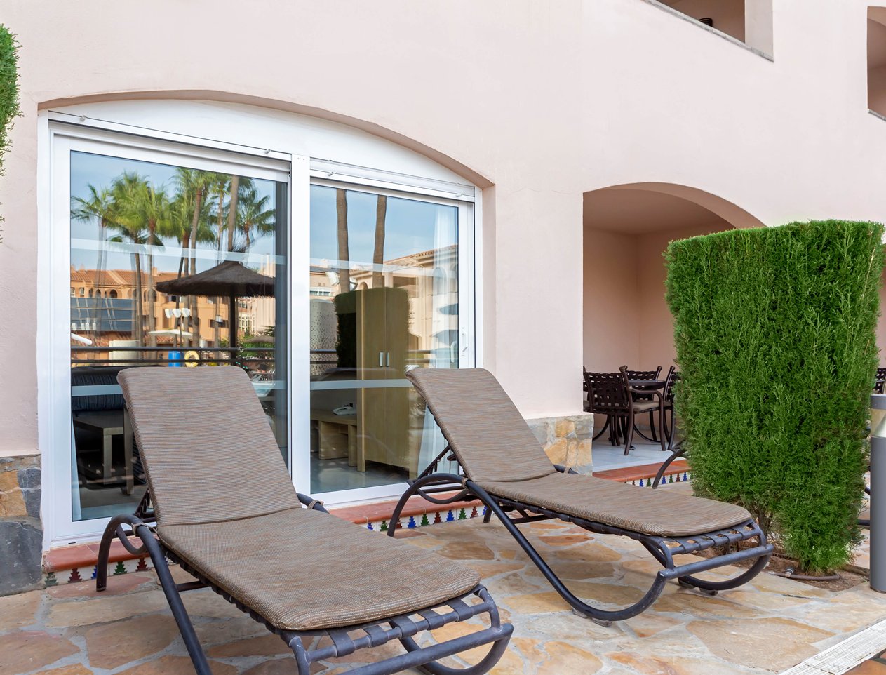 The air-conditioned self-catering apartments feature a fully equipped kitchen with dishwasher, washing machine, and extensive utensils. Each bedroom includes a premium pillow-top mattress and luxury Diamond bed linen. Each apartment has a private bathroom with bath or shower plus balcony or terrace. A smart TV, universal plug socket, USB charging point, Bluetooth clock radio, and free digital magazines and newspapers from PressReader are also provided.